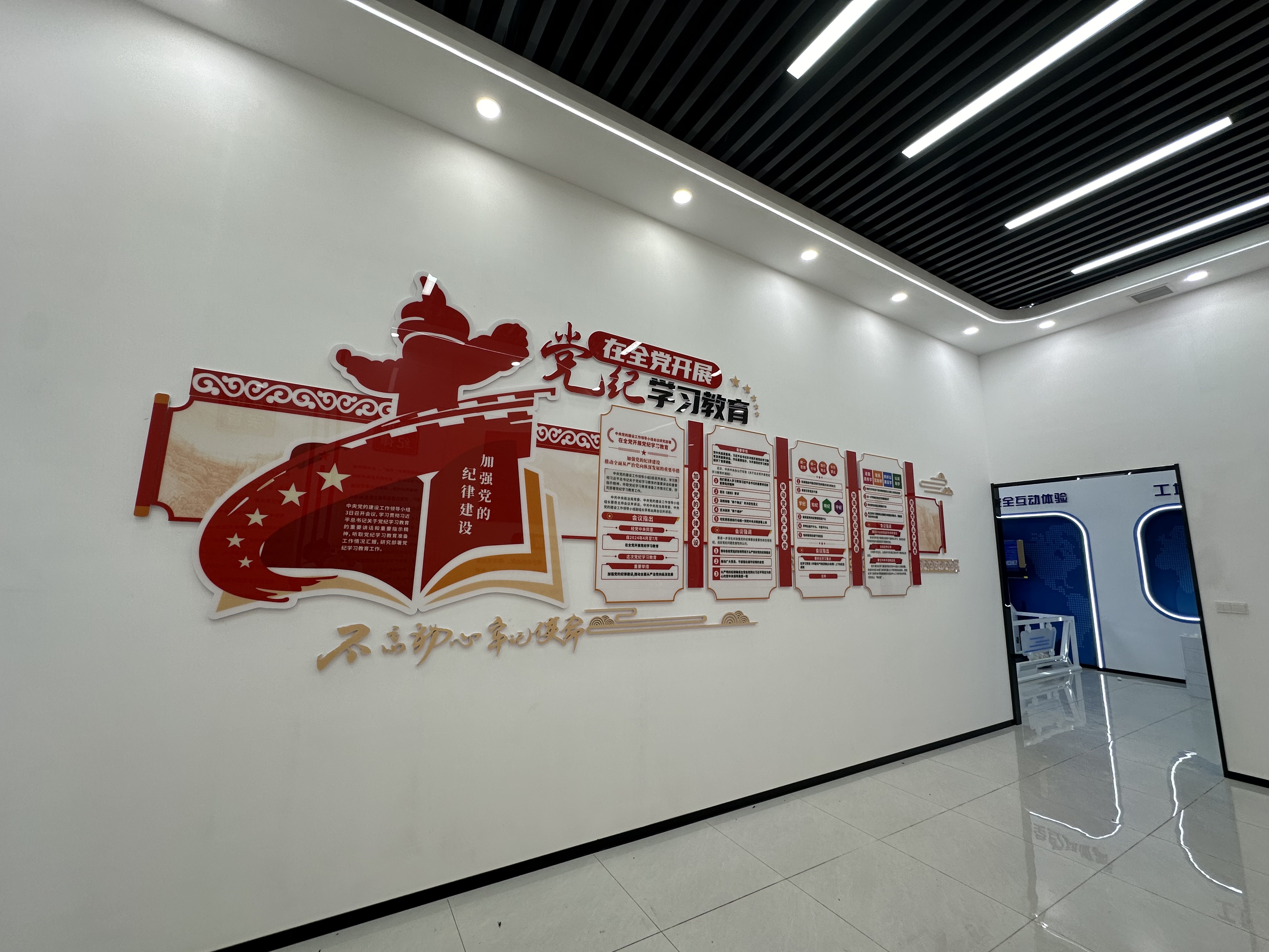 離開(kāi)安全體驗(yàn)區(qū),下一個(gè)功能區(qū)則為十分亮眼的黨建文化區(qū)。大幅的長(zhǎng)城壁畫(huà),振奮人心的入黨誓詞,鮮艷的黨旗,無(wú)不讓參觀者的思想深受黨建文化的熏陶。